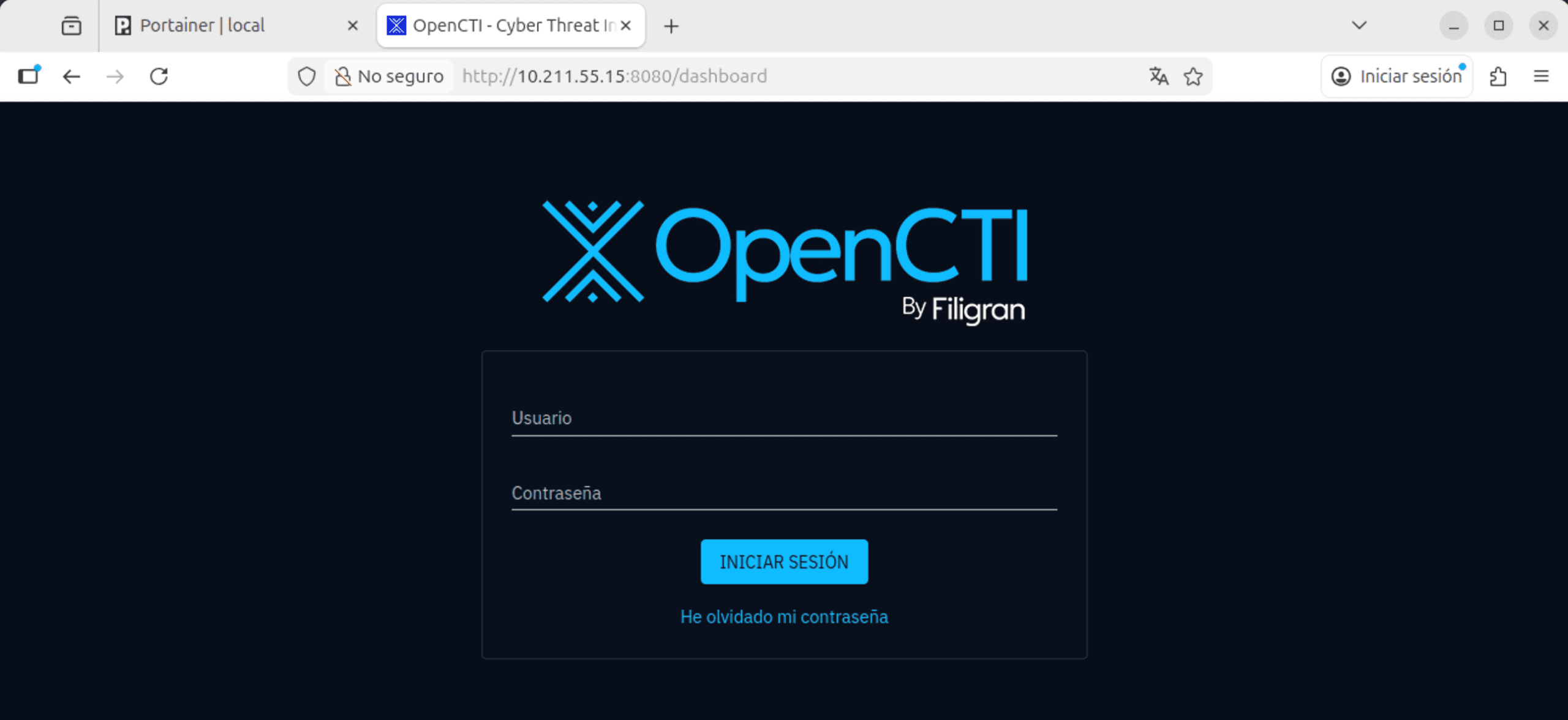 Con la IP de la máquina y el puerto 8080 accedemos al servicio web de openCTI.