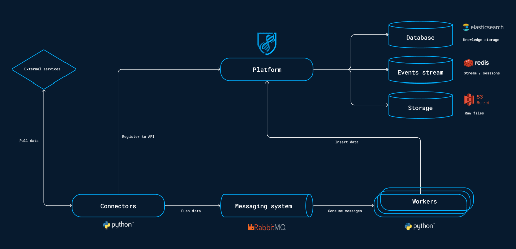 - EXTERNAL_IMPORT: Obtiene datos del exterior, los transforma a STIX y los introduce en openCTI. Por ejemplo, los de MITRE Datasets, MISP, CVE, AlienVault, Mandiant, etc.